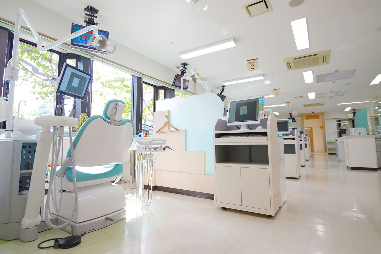 開放的な診察台でテレビや音楽、絵をお楽しみいただきながら診療をお受けいただけます。
