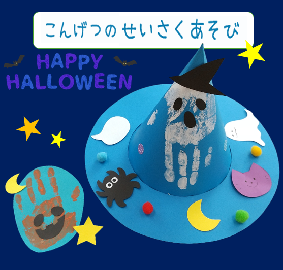 手型アートのオバケかカボチャと共に、魔女の帽子を作りませんか♪