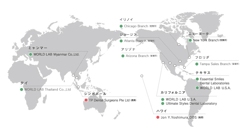 また、歯科技工の分野でも、日本、アメリカ(LA、ダラス)、ミャンマー、タイ(バンコク)に製造拠点やデザインセンターを持ち、世界各国の技工物の製造に携わらせていただいております。
