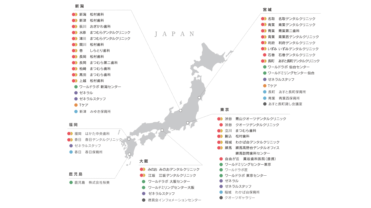 国内では、全国の歯科の患者さま総数の約0.3%に相当する、年間約70万人の患者さまの治療に携わる日本最大級の歯科医療グループになっております。