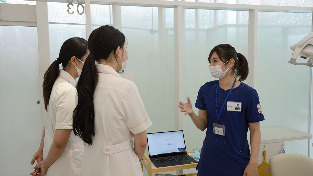 この日は2校の歯科衛生士学校の学生さまにお越しいただき、スライドショーによる企業説明、実際の診療現場の見学、懇親会という3部構成での開催となりました。診療見学では口腔内スキャナー(歯型をデジタルデータとして採取する機器)に触れていただき、初めての体験にとても興味深いご様子でした。懇親会では、初めは緊張されていた学生さまも徐々に表情がほぐれ、今後のキャリアプラン等についてフランクにお話させていただくことが出来ました。