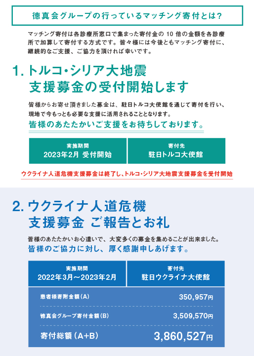 徳真会グループではマッチング寄付という募金活動を実施しております。各診療所窓口で集まった寄付金に5~10倍の金額を各診療所で加算して寄付する方式です。