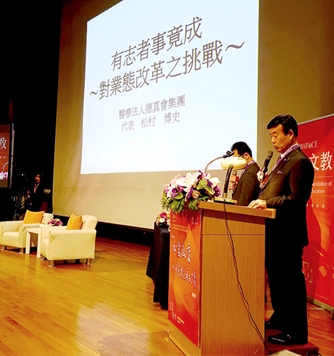 フォーラムには台湾の教育関係者、経財界の要人、台湾国内の学生など約800 名が参加し、会場の福華国際文教会館のコンベンションホールが満員となる中、「志あれば道あり~業態改革への挑戦~」をテーマに講演を行いました。出席した台湾の各大学の学長クラスの方々、台湾経財界の要人の方々からも多くの賛辞をいただき盛会に終わりました。台湾の人々は非常に勉強熱心で、若い学生達も日本の歯科界で功績を残してきた松村代表から多くの事を学ぼうと真剣に講演に聞き入っている姿がとても印象的でした。