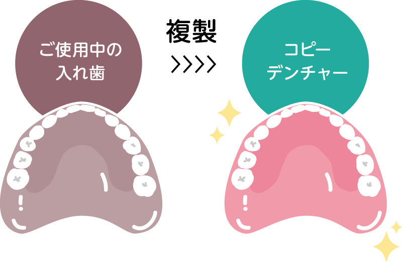 ご使用中の入れ歯を複製した予備の入れ歯「コピーデンチャー」があれば、使い慣れた入れ歯が破損・紛失した場合も安心してお食事をとることができ、生活の不便を緩和できます。