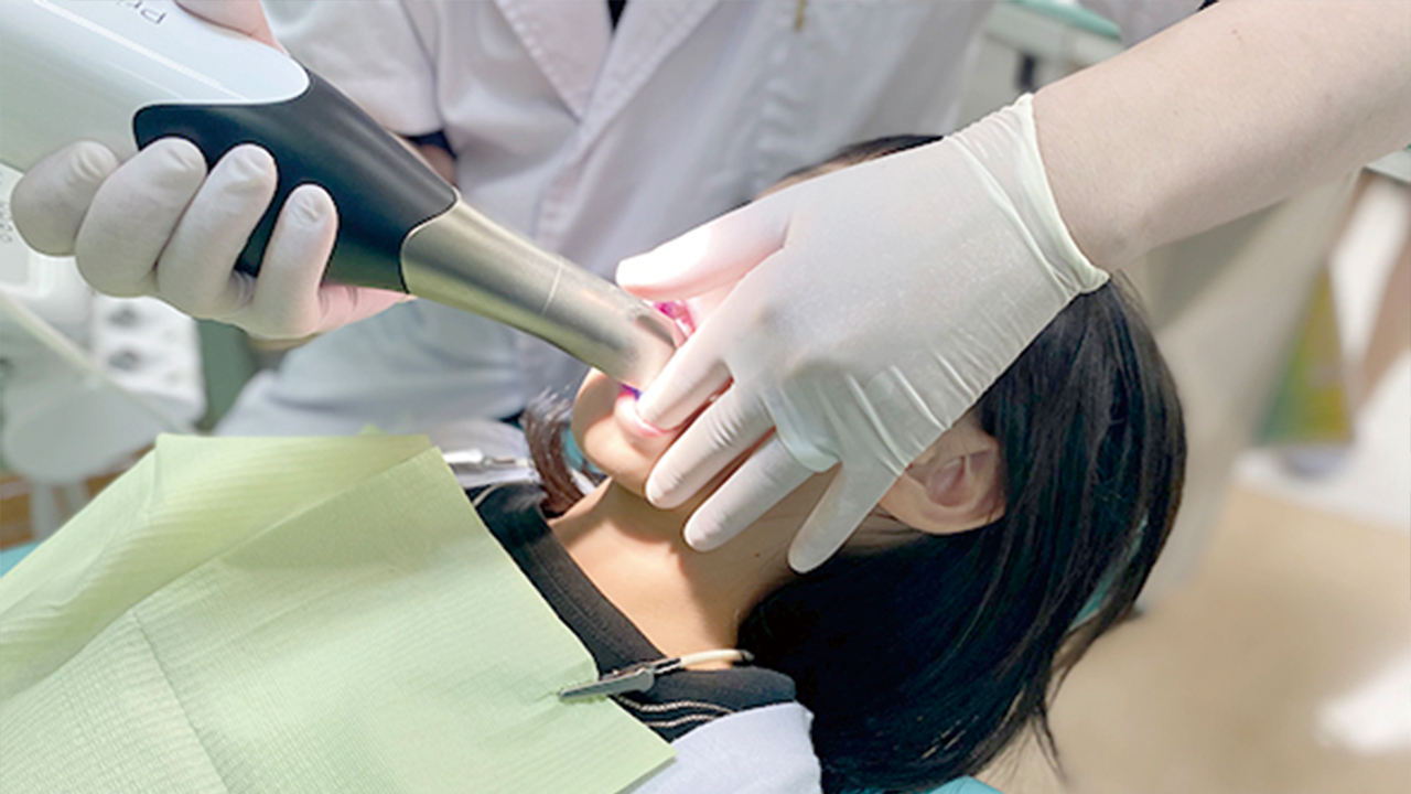 IOSスキャナーで口腔内のサイズを測り資料採取。口腔機能や身体の機能だけでなく、様々な角度から歯ならびにもアプローチするトレーニングを行い、発達に影響を及ぼす習癖の除去を目指します。