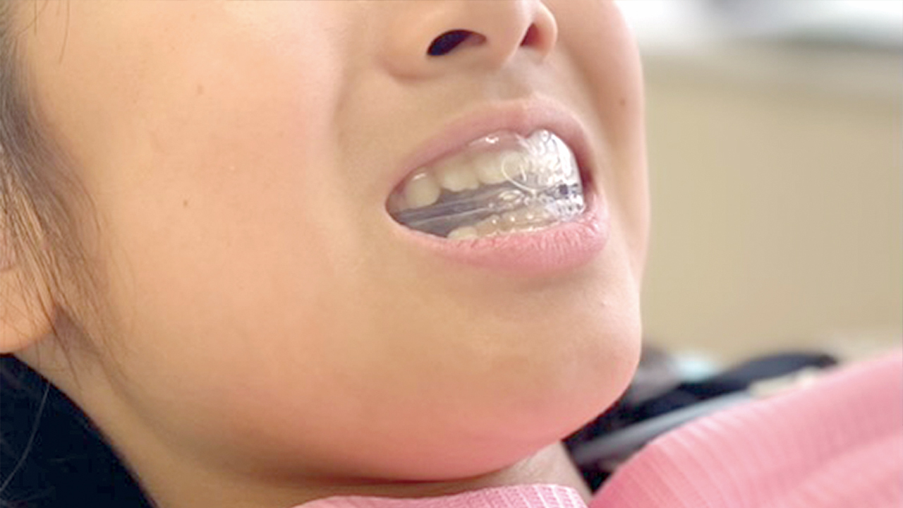 日中1時間と夜間寝ている間のマウスピース装着と、個別プログラムトレーニングを行います。外出中や食事中は矯正装置を使用する必要はなく、ブラケット装置のような違和感を感じることもほとんどありません。